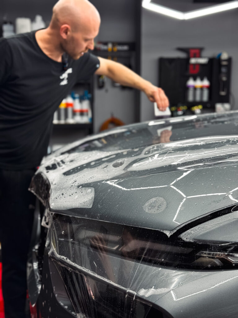 PPF se aplikuje přímo na karoserii vozu a vytváří téměř neviditelnou, elastickou vrstvu, která dokáže tlumit nárazy kamínků, zabránit oděrkám a chránit před poškozením při mytí.